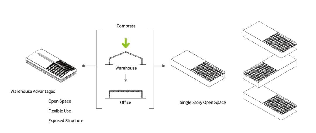 基于大量的設計研究我們得出,創意產業類項目很多都是廠房改造的,創意產業人員對于Warehouse空間類型情有獨鐘,究其原因應該是其開敞的平面、靈活的空間和外露的結構。為此,我們首先確定了開闊大平層的空間類型。