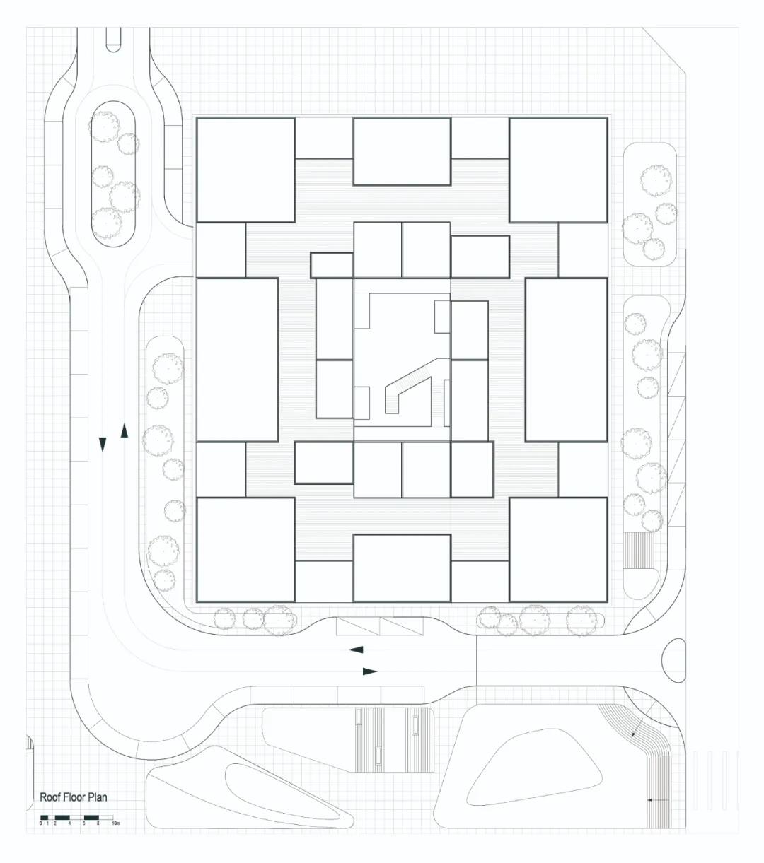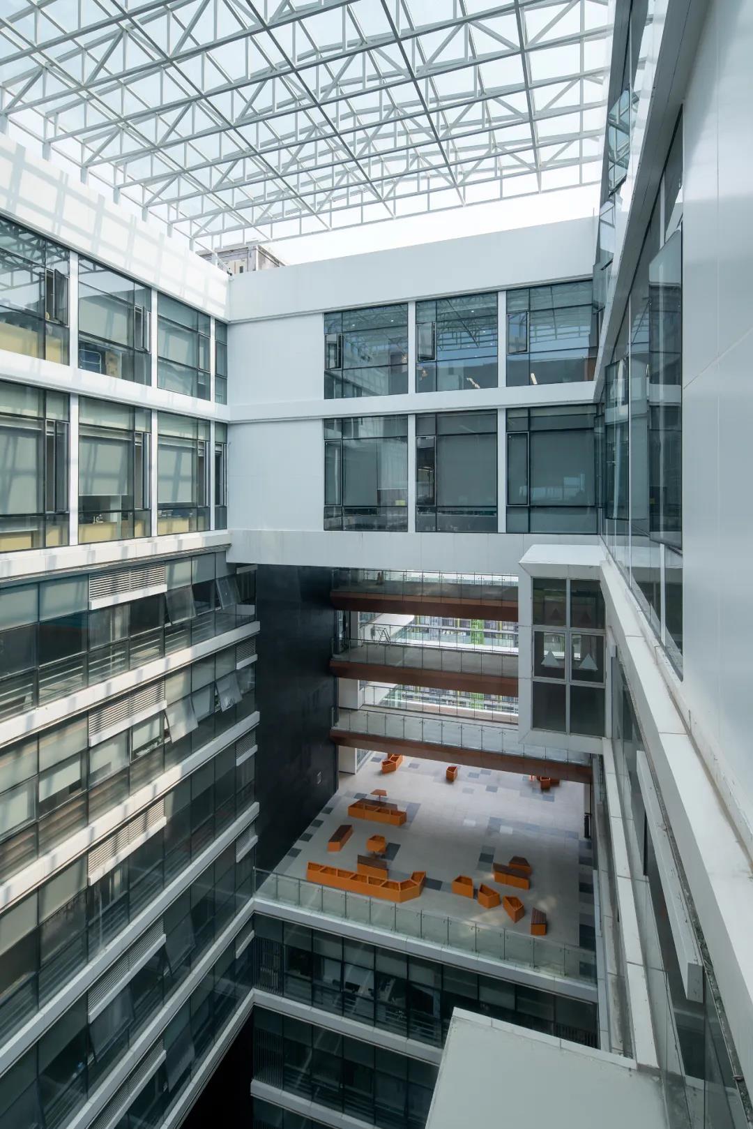 為了在高層建筑中實現類似低層廠房建筑的街道公共空間,我們打開建筑的“核心”,把一個“大核”拆解成幾個“小核”,讓建筑原本的“實心”變成“空心”,有更大的空間撐滿可建設用地,樓板圍繞四個核心筒像搭積木一樣展開,并在頂層預留了未來企業擴展的空間(后續也確實被入駐企業改造擴建了)。