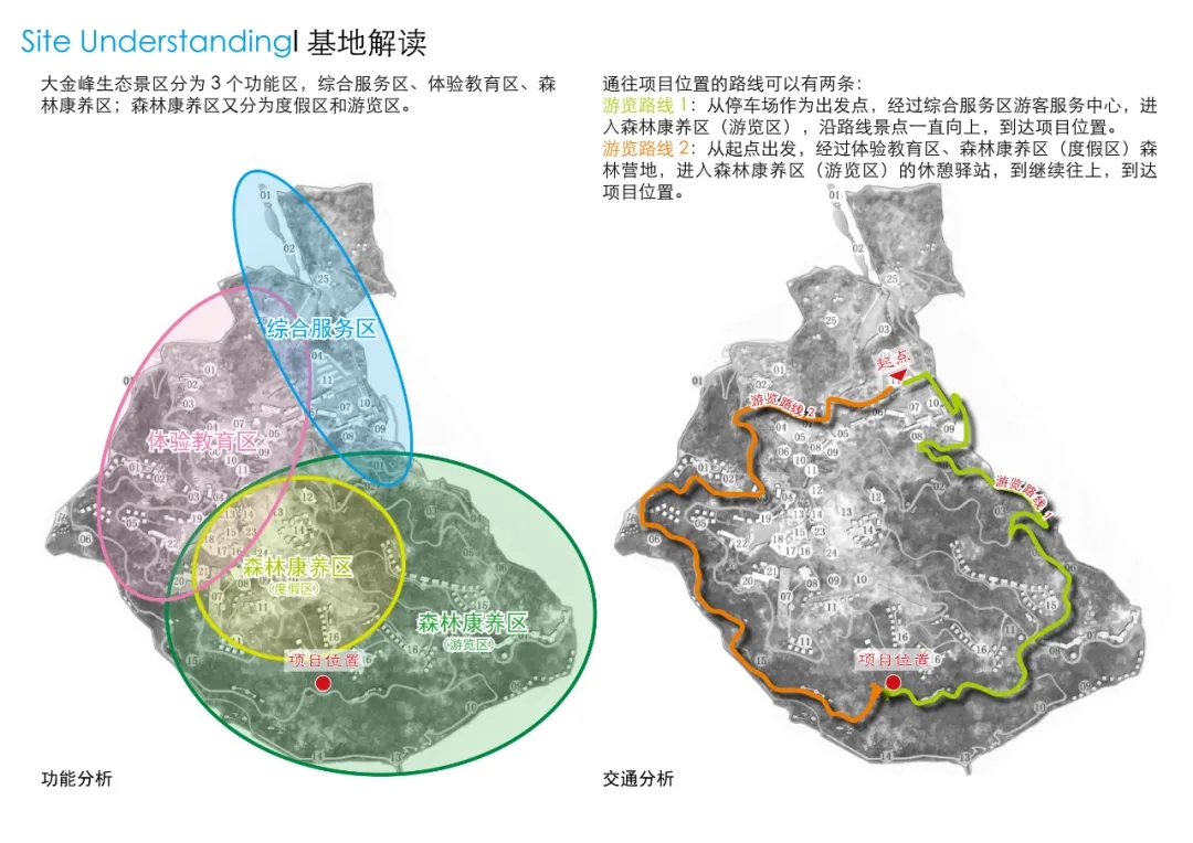 本項目位于廣州從化區客天下大金峰生態景區,海拔666米的自然生態景區,景區面積2萬余畝。項目屬于森林康養區(瀏覽區)里的一處景點,位于半山腰處,背靠488.55高的山丘,地塊東西兩側分別是兩個山谷,作為景觀節點,地理位置優越,可以一覽景區全部樣貌,景觀視線優越。