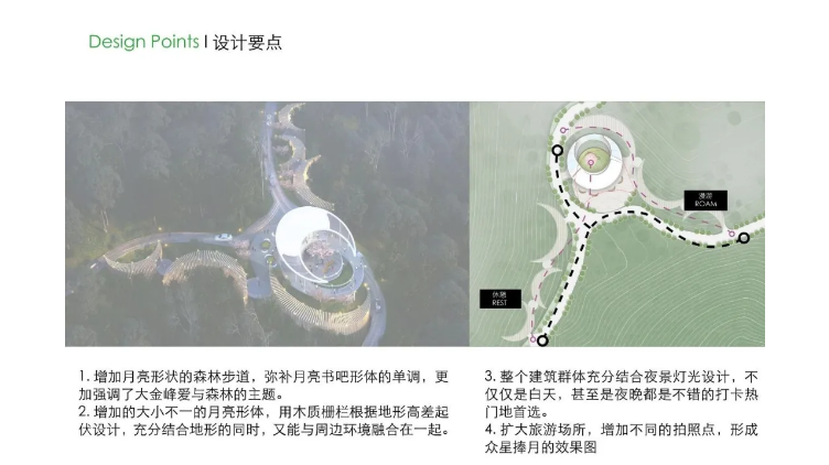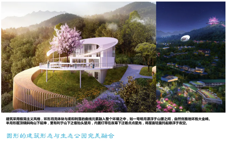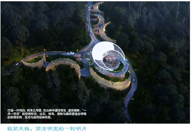 設計理念:以“月.境”為主題,月亮寄托“相思”,通過生態園區的景觀以及月亮的建筑形態,營造出月上柳梢頭,人約黃昏后的美好意境。簡約的書吧能容納更多人閱讀休閑之余,也有花前月下一覽眾山小之意,讓閱讀更有意境,更富有生命;設計理念延伸至“愛情四部曲”—憧憬—擁有—執子之手—相擁,契合世間愛情經歷。利用極簡的風格,打造一輪簡潔透澈的明月,月亮的建筑形態與生態公園完美融合。